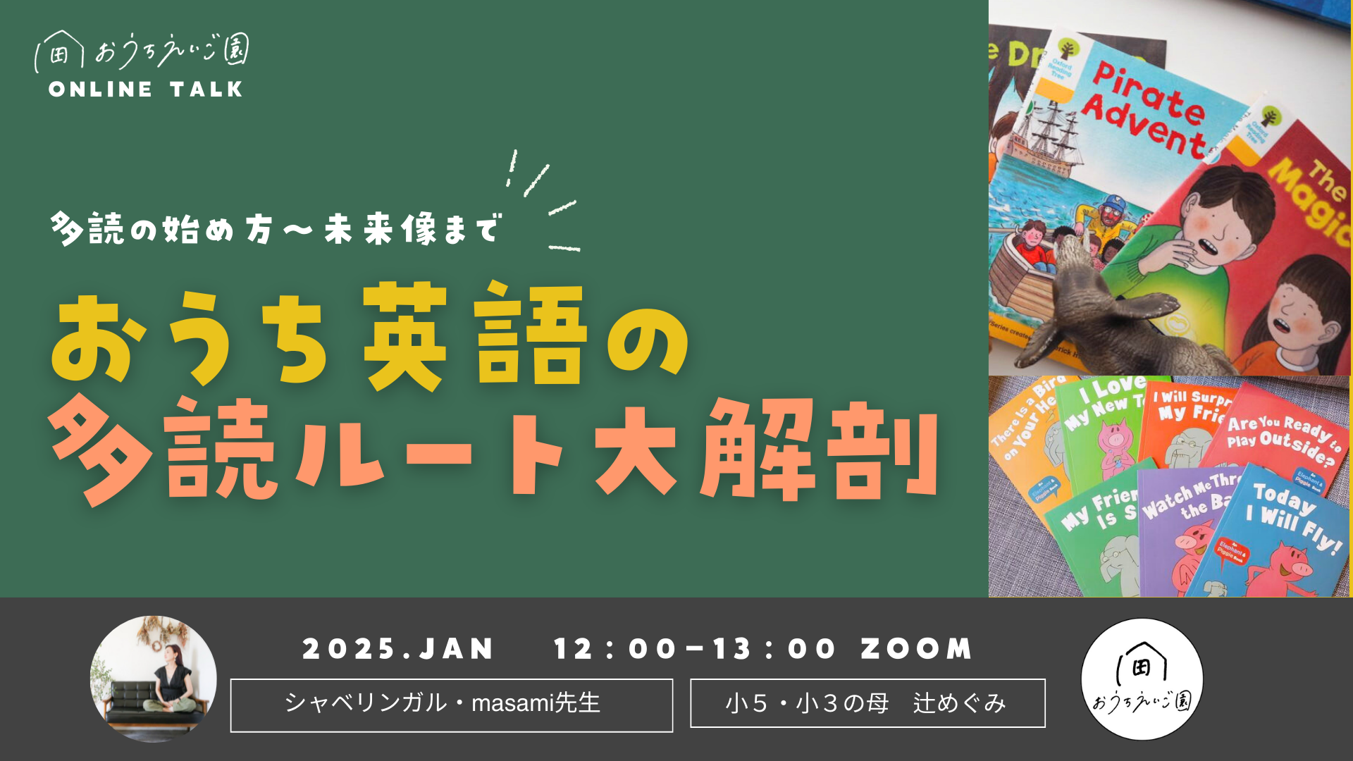 おうち英語多読教室シャベリンガル代表masami(おうち英語歴 15年)の監修を受け、おうち英語の中核メディアを運営する辻めぐみ(おうち英語歴10年)が制作しました。数多くのおうち英語親子と対面で長期的に関わってみえてきた「失敗しない家庭の共通点」「再現性あるおうち英語の手法」を1年かけて精査しています。個人の経験談ではないので、多くの方にお試しいただける内容です。